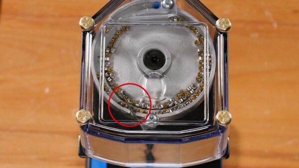 I connected the unit to power and dumped 100 primers onto the top tray. (It’s important to wear safety glasses when working with primers.)