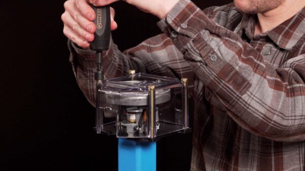 Pressing the blue power button spurs the unit to run for two minutes before automatically powering off. It takes two minutes or less for it to completely fill a primer tube, each of which holds 100 primers.
