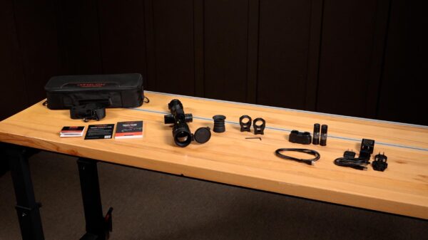 The scope comes in a convenient, zippered carrying case. The case itself is impressive with a padded interior, velcro straps for the optic, and dedicated places for everything. The optic has an integrated front cap and comes with rings, instructions, rear telescoping rubber eyepiece, power cables, battery charger, batteries, and charging brick adapters.