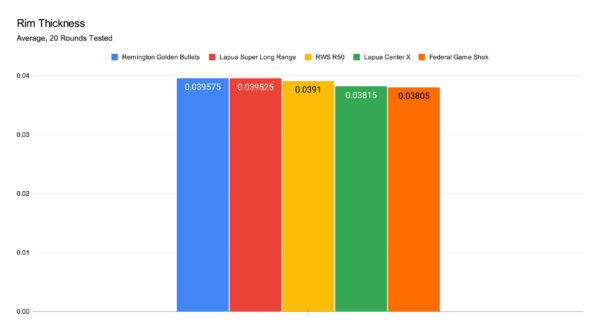 The average rim thickness across all five types of ammunition tested ranged from 0.03805” to 0.039575”.