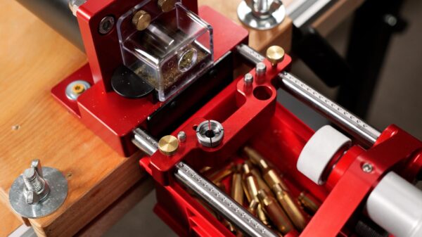 I decided to start by trimming some 6mm Creedmoor brass, selecting the appropriate collet and pilot (6mm – #24). To install the pilot, I first had to remove the machine’s protective cover and loosen a set screw to remove the trimmer head assembly.