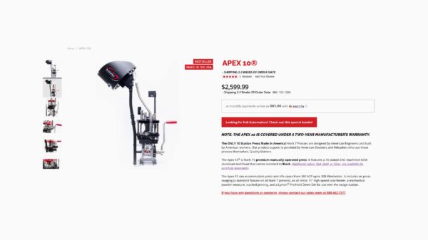 The Apex 10 is designed for the sport shooter and comes as a hand press for approximately $2500. There is an automated bundle option with Autodrive that starts closer to $5200.