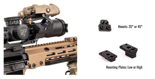 The MATCH Offset Mount kits are available in both low or high options with either a 35 degree or 45 degree offset. The 35 degree version fits better on LPVO optics and is better for carbines. The 45 degree version works best on larger magnified optics and is better for bolt guns. The mounts allow for the adjacent mounting of a red dot sight for fast target acquisition.