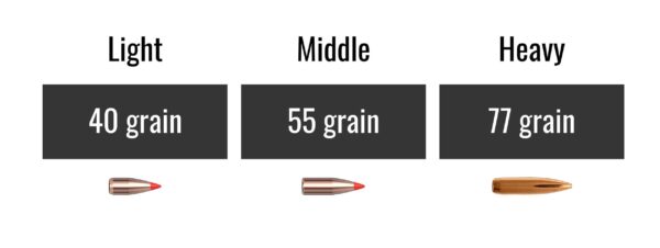 22 caliber projectile weights span a wide range. We decided to generalize, labeling 40-grain bullets as light, 55-grain bullets as in the middle, and 77-grain bullets as heavy. 55-grain bullets have been a fixture in military ammunition for decades, as have 77’s, particularly for match purposes.
