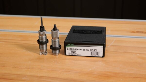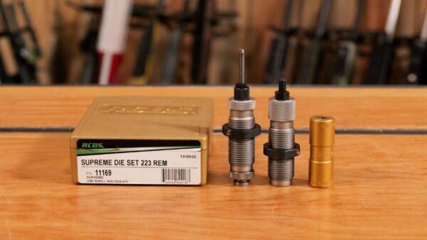 A number of different die sets exist from a variety of manufacturers. RCBS has perhaps the most extensive portfolio. Their supreme die set comes with a sizing die, seating die, and case gauge — all must-haves for AR reloading.