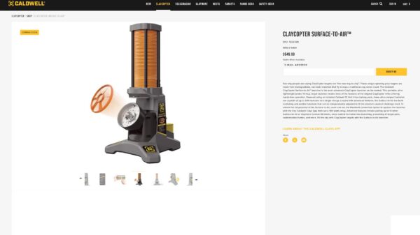See why people are saying ClayCopter targets are “the new way to clay”. These unique spinning prop targets are made from biodegradable, non-toxic materials that fly in ways a traditional clay never could. The Caldwell ClayCopter Surface-to-Air™ launcher is the most advanced ClayCopter launcher on the market. This portable, ultra-lightweight (under 10 lbs.), target launcher retains most of the features of the original ClayCopter while offering hands-free operation. Powered using an included Caldwell 12 Volt Li-Ion battery pack, these ultra-compact batteries are capable of up to 300 launches on a single charge. Loaded with advanced features, the Surface-to-Air has both oscillating and wobble functions that can be independently adjusted to fit the shooter’s desired challenge level. To unlock the full potential of the Surface-to-Air, users can use the Bluetooth connection option to operate the launcher with the free Caldwell Clays App from up to 100 yards away. Advanced features include pairing up to 10 other Surface-to-Air or Claymore Connect throwers, voice control for hands-free launching, presenting of target pairs, customizable flurries, and more. Fill the sky with ClayCopter targets with the Surface-to-Air launcher.