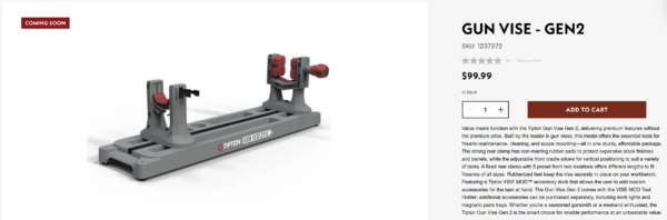 Value meets function with the Tipton Gun Vise Gen 2, delivering premium features without the premium price. Built by the leader in gun vises, this model offers the essential tools for firearm maintenance, cleaning, and scope mounting—all in one sturdy, affordable package. The strong rear clamp has non-marring rubber pads to protect expensive stock finishes and barrels, while the adjustable front cradle allows for vertical positioning to suit a variety of tasks. A fixed rear clamp with 5 preset front rest locations offers different lengths to fit firearms of all sizes. Rubberized feet keep the vise securely in place on your workbench. Featuring a Tipton VISE MOD™ accessory dock that allows the user to add custom accessories for the task at hand. The Gun Vise Gen 2 comes with the VISE MOD Tool Holder; additional accessories can be purchased separately, including work lights and magnetic parts trays. Whether you’re a seasoned gunsmith or a weekend enthusiast, the Tipton Gun Vise Gen 2 is the smart choice for reliable performance at an unbeatable value.