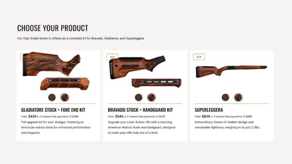 The cost premium is about $200 higher than the original models and they are only sold as a complete package for lever actions and shotguns. The Superleggera bolt-action stock is a single piece.