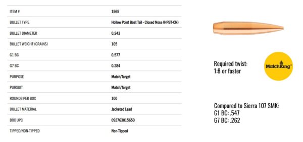 The Sierra 105-grain MatchKing has a G1 BC of 0.577 and a G7 BC of 0.284. These are a marked improvement over the BC’s of the 107-grain MatchKing (G1: 0.547, G7: 0.262).