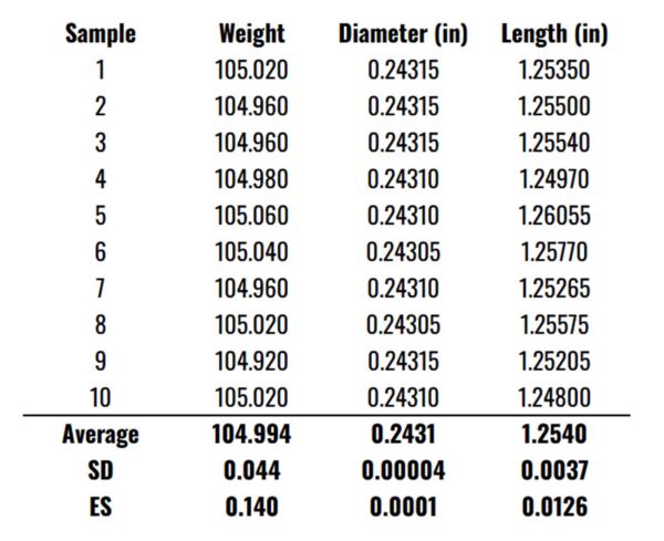 The average diameter was 0.243” with an SD of 0.00004” and ES of 0.000”.