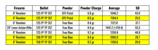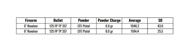 If my goal was to prioritize a load that would perform through both my 6” revolver and 20” rifle, I would have selected 6.9 grains of CFE Pistol with the Berry’s 125 FP-TP. I highlighted my ideal revolver-specific loads in the chart below.
