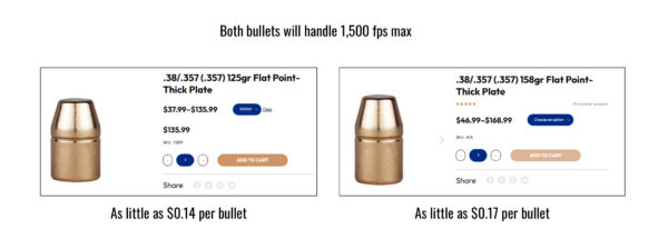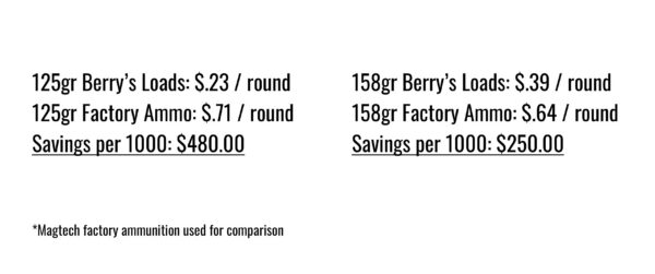 The Berry’s 38/357 125-Grain FP-TP bullets are available for as little as $0.14 per bullet and the 158-grain variant can be found for as little as $0.17 per bullet. While I used new brass that I had on hand, all calculations assume the use of fired brass for optimum savings.