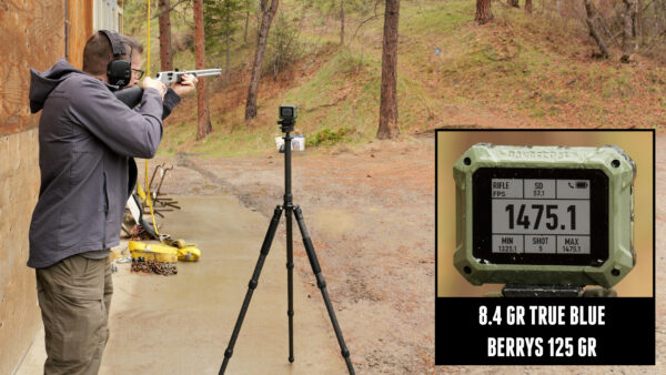 I fired the 8.4-grain load through both the 6” revolver and 20” lever-action, noting an average velocity increase of 319.4 fps.