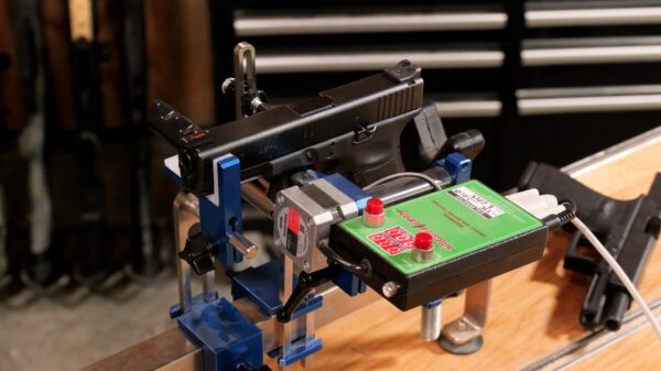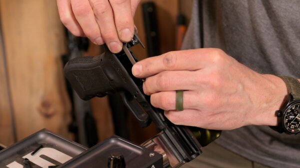 I decided to install the ACE system on my GLOCK 17, making sure it was clear before securing it in my Arrow Products rock vise. I used the Picatinny clamp on the vise accessory rail to hold the pistol.
