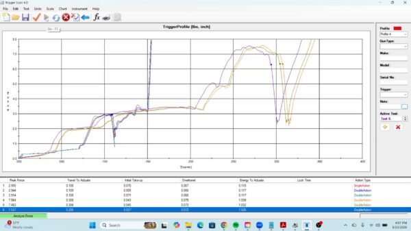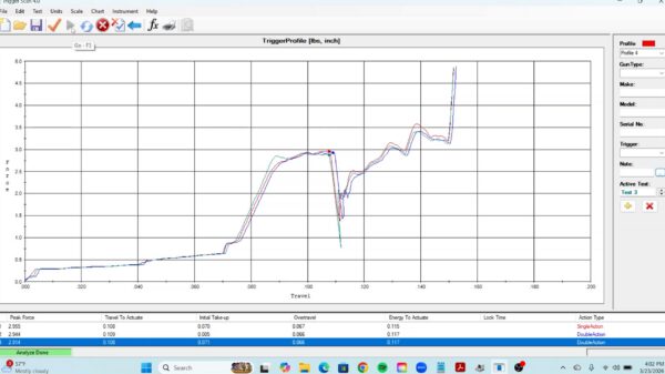 The factory trigger graphs were not nearly as smooth or consistent. The peak force required was consistent around 7.564 lbs. and the travel to actuate was about three times that of the ACE system.
