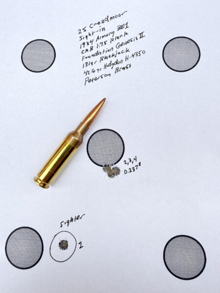I bore-sighted the completed rifle at 100 yards to get on paper, using a load I had previously worked up: 131 grain Blackjack bullets over 42.6 grains H4350 in Peterson Small Rifle Primer Brass.