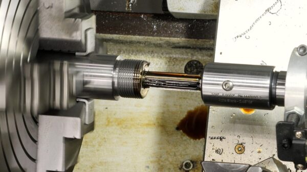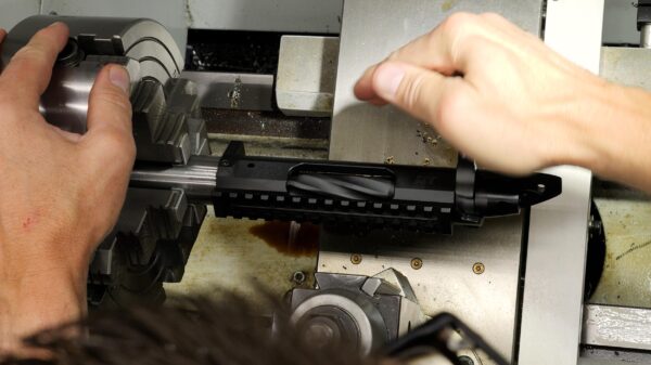 After pre-drilling, I indicated the throat area to 0.0001”, and single-point bored the chamber area true with a single-point boring bar.
